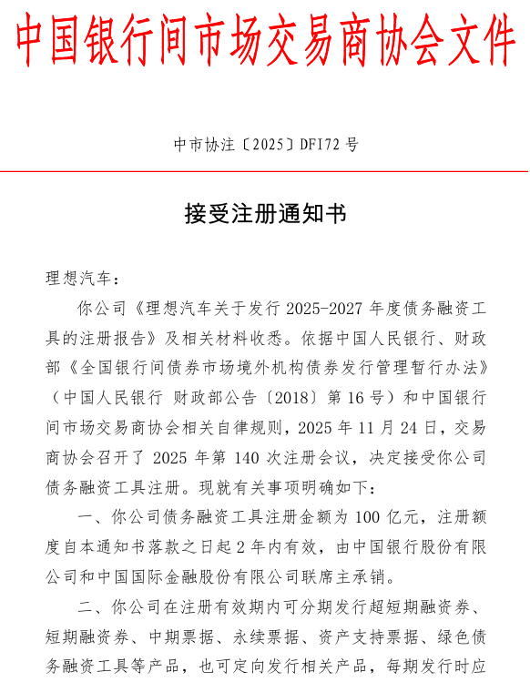 2026年1月4日,中国银行间交易商协会公告配股宝,接受理想汽车债务融资工具注册,金额为100亿元,注册额度自2025年12月3日起2年内有效,由中国银行和中金公司联席主承销。